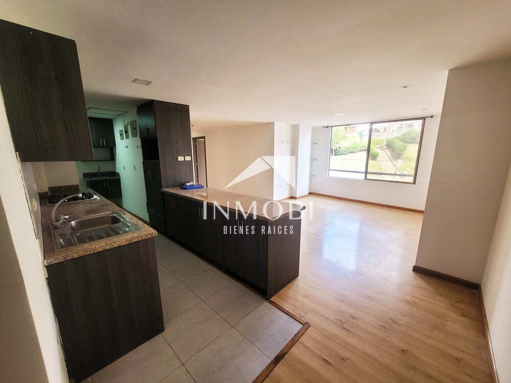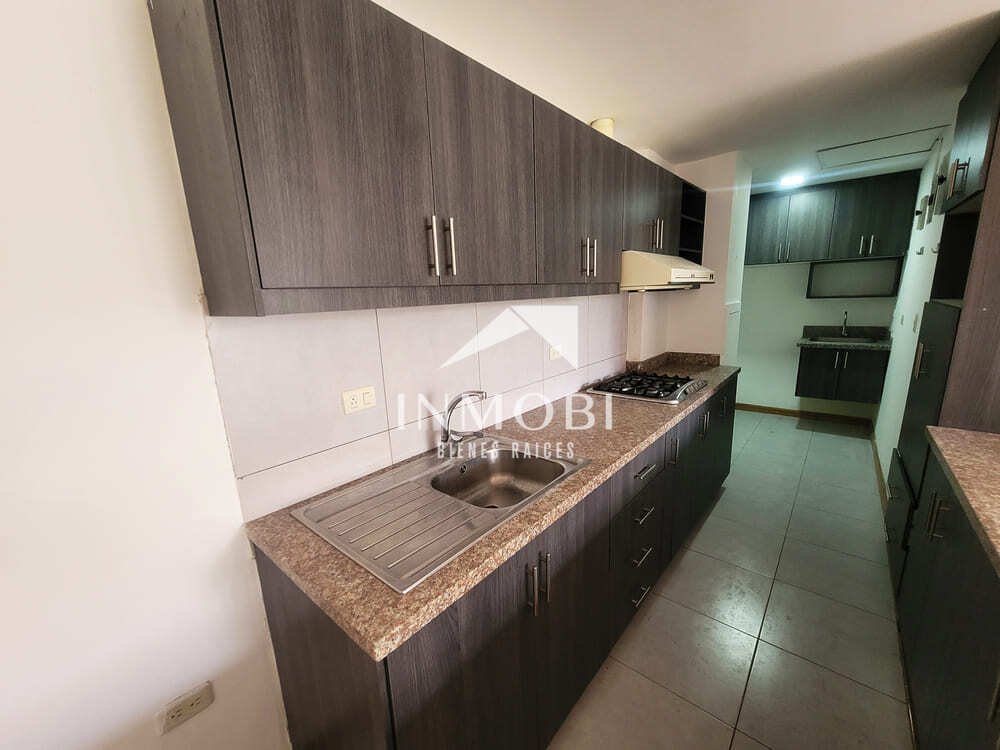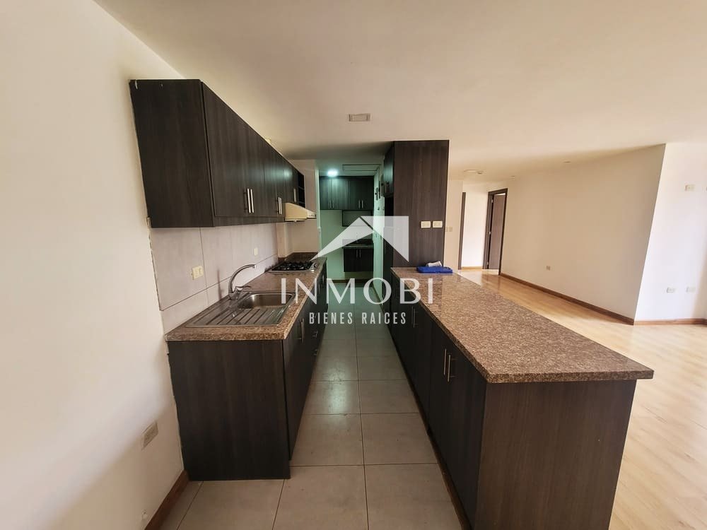 El departamento cuenta con 99,94 m² de construcción, distribuidos de manera práctica para aprovechar cada espacio. Dispone de una cocina equipada con muebles altos, bajos y encimera empotrada, conectada a una acogedora área social con muy buena iluminación natural.